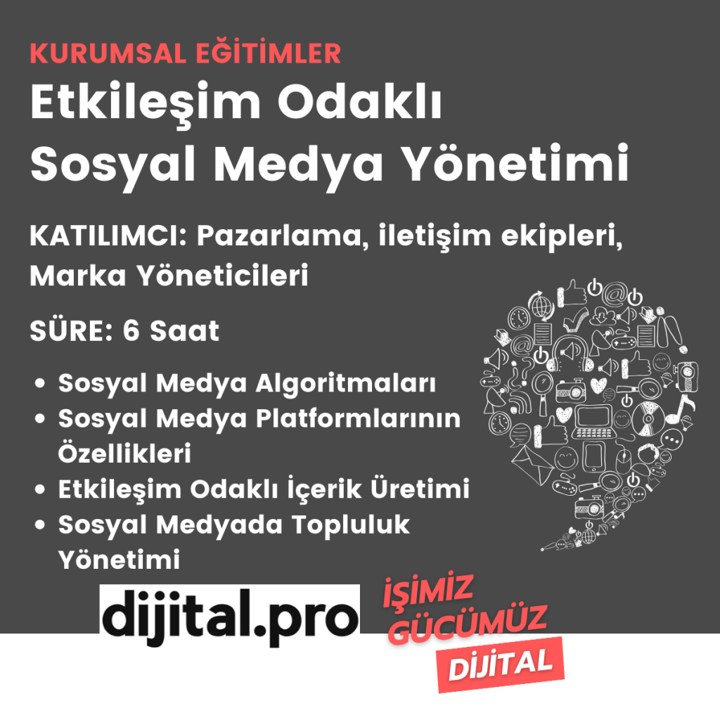 “Etkileşim Odaklı Sosyal Medya Yönetimi” eğitimi, markaların sosyal medya platformlarında etkileşimi maksimize etmek ve hedef kitleleriyle daha etkili bir şekilde iletişim kurmak için gerekli stratejileri ve teknikleri öğrenmelerini sağlamak üzere tasarlanmıştır. Bu eğitim programı, sosyal medya algoritmalarının anlaşılması, platformların özelliklerine göre içerik üretimi, etkileşim odaklı stratejiler geliştirme ve topluluk yönetimi gibi konuları kapsamaktadır.